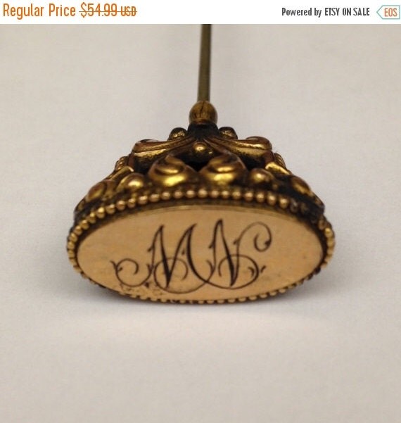 Storewide 25% Off SALE Vintage Gold Tone Monogramed Ladies Victorian Style Hat Pin Featuring Elegant Raised Cornice Floral Design by ClevelandFinds
