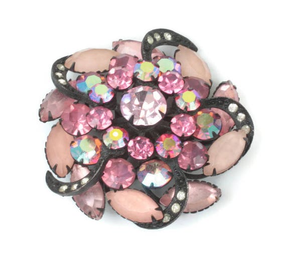 Pink Rhinestone Pinwheel Brooch AB Frosted Stones Japanned Finish Dimensional Vintage by PastSplendors